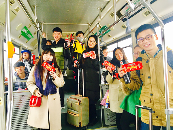 2017年1月13日“春運(yùn)大潮”正式開始,第一波主流人群就是學(xué)生,除了搶車票,擠候車廳,還有前奏就是擠公交,搶出租車去車站。為了讓同學(xué)們更順利的回家,可口可樂在鄭州5所高校打造了愛心專列巴士,持續(xù)5天往返于車站和學(xué)校之間,助力按時(shí)抵達(dá)。“還有什么比回家更開心的嗎?還有什么比,邊喝可口可樂邊看別人擠公交車更開心的嗎?愛心巴士好贊,讓我們的歸家路無比快樂和暖心!” 河南輕工業(yè)大學(xué)大三耿嘉尉同學(xué)高興的說著。