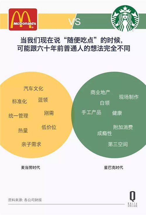 而從很多方面來看,星巴克和麥當(dāng)勞都很相似:將盡可能多的環(huán)節(jié)標(biāo)準(zhǔn)化,提供穩(wěn)定且高品質(zhì)的產(chǎn)品和服務(wù);改造供應(yīng)鏈和生產(chǎn)環(huán)節(jié),提高效率……最重要的是——麥當(dāng)勞賣的不是漢堡,而是連鎖服務(wù)體系,星巴克同樣賣的不是咖啡,而是“第三空間”理念。