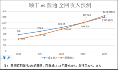 順豐全網(wǎng)收入份額一度達20%。但隨著增速落后逐年下滑,很可能要失去老大地位。圓通申通單票運費是順豐的1/2,只要件量是順豐的2倍。就有可能超過順豐。2016年2月圓通老板娘張小娟在杭州兩會上透露圓通2015年總件量約35億件(實際30億票),全網(wǎng)營收350億元(實際可能為300億元)。根據(jù)圓通發(fā)布的業(yè)績預告,2016年件量和收入都大于40%的增長。全網(wǎng)收入可能超420億元。假若保持這種趨勢下去,圓通甚至中通、申通等都可能在接下來三五年內(nèi)在全網(wǎng)收入上超越順豐, 甚至比順豐提早突破千億大關。順豐可能掉至三四名甚至更后。