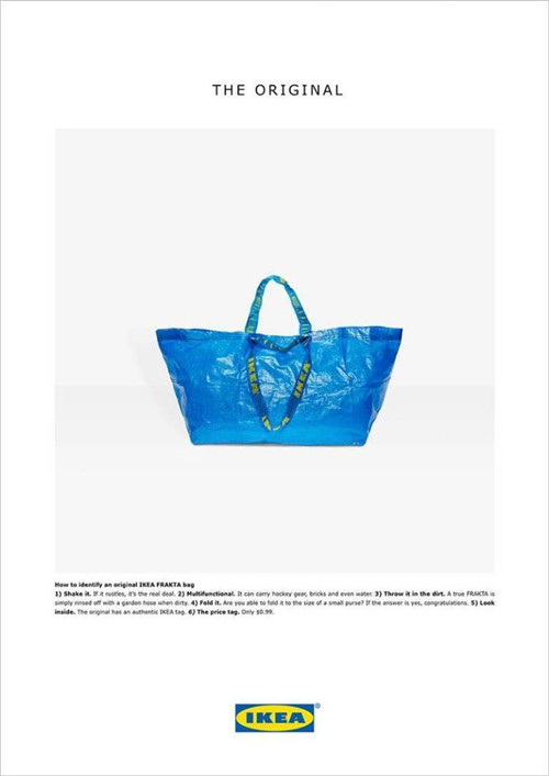今年4月,巴黎世家推出新款購(gòu)物托特袋,售價(jià)2145美元。而這件價(jià)格不菲的托特袋正是宜家售價(jià)4塊5人民幣的Frakta購(gòu)物袋的翻版。