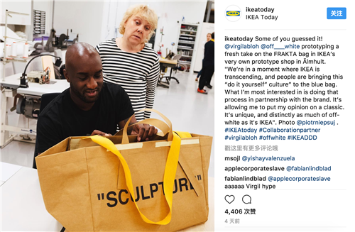 宜家宣布合作的同時(shí),還在其官方ins上面貼出了 Off-White 創(chuàng)始人兼創(chuàng)意總監(jiān) Virgil Abloh 設(shè)計(jì)的聯(lián)名 FRAKTA 購(gòu)物袋,包的一側(cè)還寫(xiě)著“sculpture”。