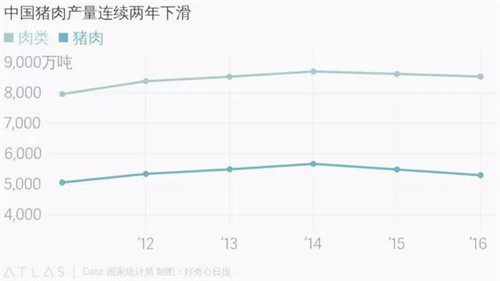 這或許只是個(gè)開始,根據(jù)咨詢公司 Euromonitor 的估算,中國(guó)豬肉銷量從 2014 年的 4249 萬噸減少至去年的 4085 萬噸,而且今年還會(huì)繼續(xù)下跌。
