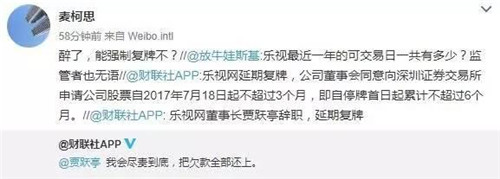 另外,關于樂視網股票復牌的事情,公告也一并做了回復:公司董事會同意向深圳證券交易所申請公司股票自2017年7月18日起不超過3個月,即自停牌首日起累計不超過6個月。