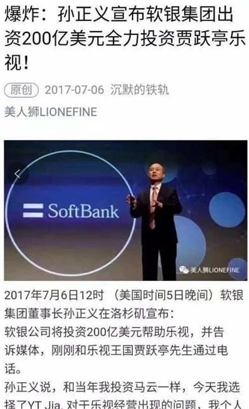 凡是相信“孫正義投資樂視200億美元”的人智商都需要充值。第一,軟銀自己因為巨資收購ARM資金鏈都很緊,哪來這么多現(xiàn)金?第二,這個世界上沒任何互聯(lián)網公司能拿到單筆超過50億美元的投資。第三,文章那么多驚嘆號……孫正義表示這個鍋我不背!一看就是個憤憤蹭熱點的,不值得為這種垃圾信息浪費時間