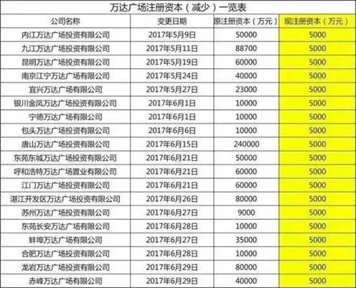 2017年5月9日至6月29日,全國(guó)19家萬(wàn)達(dá)商業(yè)項(xiàng)目公司——各地的萬(wàn)達(dá)廣場(chǎng)投資公司集中進(jìn)行了減資,注冊(cè)資本金由原先最高24億元,最低9000萬(wàn)元,統(tǒng)一減至5000萬(wàn)元。