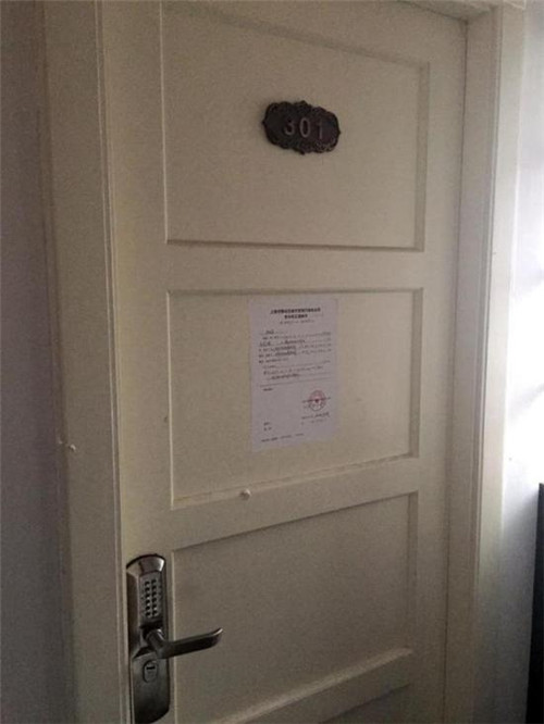 長樂路764弄19號樓3樓,裝著密碼門的就是這間民宿。2樓業(yè)主反復(fù)投訴后,城管部門上門檢查時發(fā)現(xiàn)民宿侵占了一部分過道的空間,故城管向業(yè)主下發(fā)了責(zé)令改正通知書。圖中貼于門上的,即是城管下發(fā)的通知書。