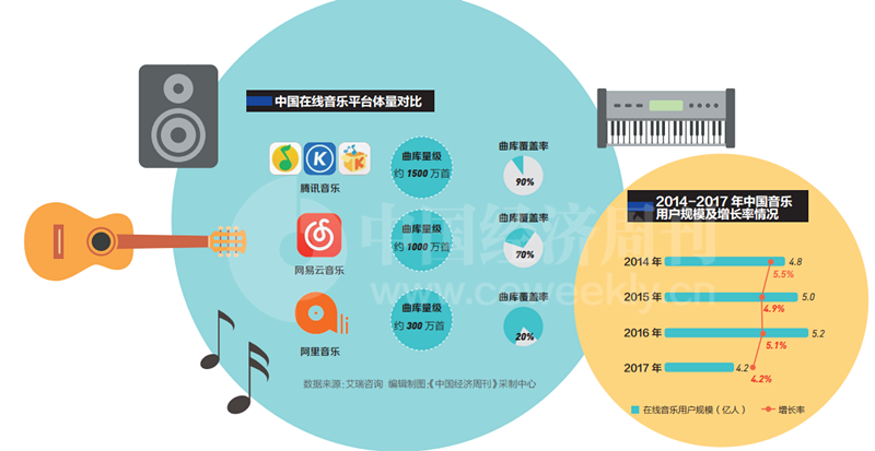 2016年7月,QQ音樂與酷我音樂、酷狗音樂并入騰訊音樂旗下后,騰訊開始對數(shù)字音樂版權(quán)著重布局。2017年3月和5月,騰訊音樂先后拿下中國大陸地區(qū)對環(huán)球音樂所擁有的音樂詞曲獨(dú)代權(quán)和數(shù)字版權(quán)分銷權(quán),并為此付出了3.5億美元現(xiàn)金及購買環(huán)球音樂1億美元期權(quán)的代價(jià)?!敖刂聊壳埃蚍秶鷥?nèi)有200多家唱片公司持有數(shù)字音樂的版權(quán),目前90%以上都已經(jīng)被騰訊拿下?!币晃痪W(wǎng)易云音樂內(nèi)部人士告訴《中國經(jīng)濟(jì)周刊》記者,騰訊音樂目前擁有的版權(quán)數(shù)量、廣度和對版權(quán)的投入都是業(yè)內(nèi)第一,其中不少是“獨(dú)家代理權(quán)”,相當(dāng)于緊緊地扎起了一個(gè)籬笆。
