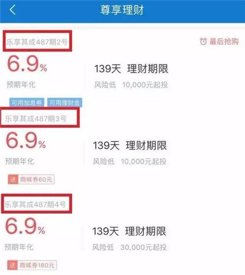 樂視金融APP上在售的樂享其成系列產(chǎn)品顯示,其中487期2號、3號和4號產(chǎn)品的投資期限完全相同,收益率也同為6.9%,并且都是7月7日起計算利息,只是2號和3號產(chǎn)品的理財起點起1萬元,4號產(chǎn)品的理財起點為3萬元。