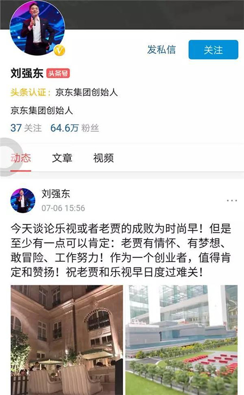 京東集團創(chuàng)始人劉強東在個人認證頭條號對樂視表示聲援,劉強東稱:今天談?wù)摌芬暬蛘呃腺Z的成敗為時尚早!但是至少有一點可以肯定:老賈有情懷、有夢想、敢冒險、工作努力!作為一個創(chuàng)業(yè)者,值得肯定和贊揚!祝老賈和樂視早日渡過難關(guān)!