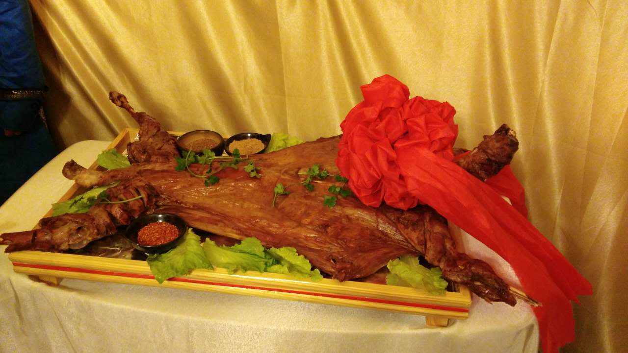 只一道烤全羊,酒店大廚都頗費(fèi)工夫。食材精選肉質(zhì)鮮嫩的鮮羊,肉質(zhì)均勻。因?yàn)閷?duì)“原汁原味”的極致追求,整只羊需提前三個(gè)小時(shí)炭火慢慢烤制??救蛏舷螅珴山瘘S,表皮脆嫩,鮮香襲人,令人垂涎欲滴。此時(shí),酒店工作人員會(huì)為當(dāng)晚最尊貴的客人獻(xiàn)上哈達(dá),并邀請(qǐng)客人一起舉行“開羊儀式”,在蒙古,這象征主人對(duì)朋友最誠摯的祝福。