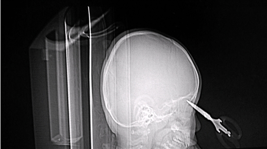 小孩子的CT顯示,剪刀插進(jìn)了右側(cè)鼻根部,穿破了顱骨。