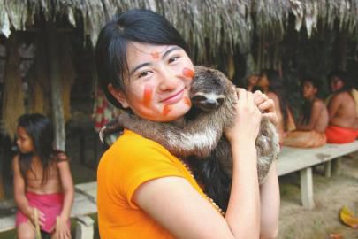 鄧深很喜歡小動(dòng)物,這是她在旅行中和樹(shù)懶的合影。