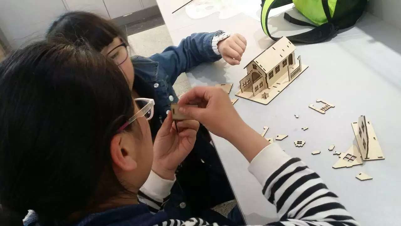 在激光加工區(qū),用激光機切割而成的大小不一、形狀各異的零件引起了同學們的興趣。同學們齊心協(xié)力,將一個個零件拼裝成了房屋模型。看著一棟棟別墅呈現(xiàn)在眼前,孩子們歡呼雀躍,體驗著動手動腦的樂趣,感受著成功的喜悅。