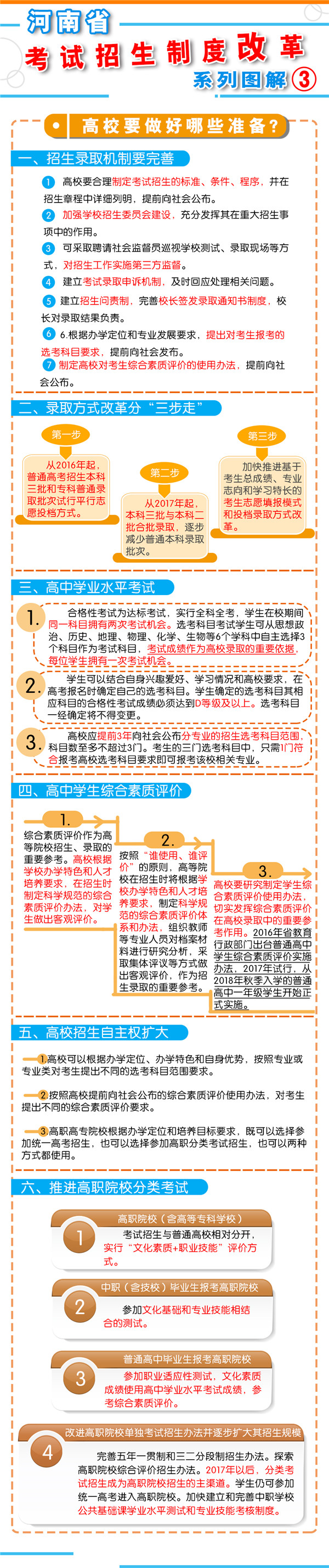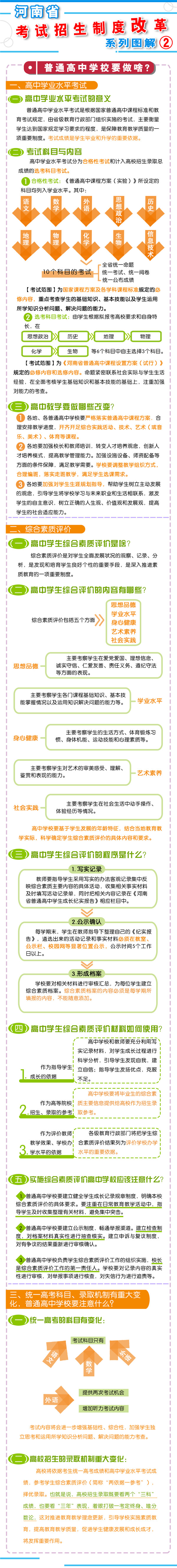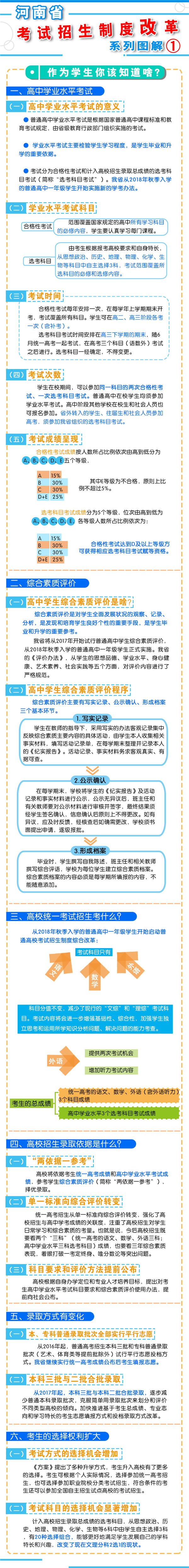 8月23日上午9時(shí),河南省教育廳召開(kāi)新聞通氣會(huì),通報(bào)了《河南省深化考試招生制度改革實(shí)施方案》(以下簡(jiǎn)稱《方案》)的有關(guān)情況?! “凑铡斗桨浮芬螅沂?018年秋季入學(xué)的普通高中一年級(jí)學(xué)生開(kāi)始啟動(dòng)高考綜合改革,考生總成績(jī)由統(tǒng)一高考的語(yǔ)、數(shù)、外3科成績(jī)和高中學(xué)業(yè)水平3個(gè)選考科目成績(jī)組成。招生錄取實(shí)行基于統(tǒng)一高考成績(jī)和高中學(xué)業(yè)水平考試成績(jī)、參考學(xué)生綜合素質(zhì)評(píng)價(jià)擇優(yōu)錄取機(jī)制。  總體目標(biāo)  到2020年,初步形成分類考試、綜合評(píng)價(jià)、多元錄取的考試招生模式,進(jìn)一步健全促進(jìn)公平、科學(xué)選才、監(jiān)督有力的體制機(jī)制,構(gòu)建順應(yīng)時(shí)代要求、符合教育規(guī)律和河南省情的考試招生制度。  主要任務(wù)  一、促進(jìn)升學(xué)機(jī)會(huì)公平  逐步增加我省考生接受優(yōu)質(zhì)高等教育的機(jī)會(huì),逐步增加農(nóng)村學(xué)生升入重點(diǎn)高校人數(shù),減少和規(guī)范高考加分,完善中小學(xué)招生辦法?! ?strong>二、改革考試形式和內(nèi)容  完善高中學(xué)業(yè)水平考試。考試分為合格性考試和計(jì)入高校招生錄取總成績(jī)的選考科目考試(簡(jiǎn)稱“選考科目考試”)。合格性考試范圍覆蓋國(guó)家規(guī)定的高中所有學(xué)習(xí)科目的必修內(nèi)容。選考科目由考生根據(jù)報(bào)考高校要求和自身特長(zhǎng),從思想政治、歷史、地理、物理、化學(xué)、生物等科目中自主選擇3科。學(xué)生在校期間,可以參加同一科目的兩次合格性考試、一次選考科目考試?! ∵M(jìn)一步規(guī)范高中學(xué)生綜合素質(zhì)評(píng)價(jià)。建立全省規(guī)范統(tǒng)一的高中學(xué)生綜合素質(zhì)檔案,完善學(xué)生綜合素質(zhì)評(píng)價(jià)電子化管理平臺(tái),客觀記錄學(xué)生成長(zhǎng)過(guò)程中的真實(shí)表現(xiàn),確保程序嚴(yán)格、公開(kāi)透明、內(nèi)容真實(shí)可信。  推進(jìn)高職院校分類考試。高職院校(含高等專科學(xué)校)考試招生與普通高校相對(duì)分開(kāi),實(shí)行“文化素質(zhì)+職業(yè)技能”評(píng)價(jià)方式。中職(含技校)畢業(yè)生報(bào)考高職院校,參加文化基礎(chǔ)和專業(yè)技能相結(jié)合的測(cè)試。普通高中畢業(yè)生報(bào)考高職院校,參加職業(yè)適應(yīng)性測(cè)試,文化素質(zhì)成績(jī)使用高中學(xué)業(yè)水平考試成績(jī),參考綜合素質(zhì)評(píng)價(jià)?! ∩罨荚噧?nèi)容改革。依據(jù)國(guó)家高中課程標(biāo)準(zhǔn)和高校人才選拔、培養(yǎng)要求,科學(xué)設(shè)計(jì)命題內(nèi)容,增強(qiáng)基礎(chǔ)性、綜合性,突出能力、創(chuàng)新導(dǎo)向,著重考察學(xué)生獨(dú)立思考和運(yùn)用所學(xué)知識(shí)分析問(wèn)題、解決問(wèn)題的能力。  三、改革招生錄取機(jī)制  完善招生選拔機(jī)制。高校要合理確定考試招生的標(biāo)準(zhǔn)、條件、程序等內(nèi)容,在招生章程中詳細(xì)列明并提前向社會(huì)公布。要加強(qiáng)學(xué)校招生委員會(huì)建設(shè),充分發(fā)揮其在重大招生事項(xiàng)中的作用。建立考試錄取申訴機(jī)制和招生問(wèn)責(zé)制,校長(zhǎng)對(duì)錄取結(jié)果負(fù)責(zé)。  改革錄取方式。從2017年起,本科三批與本科二批合批錄取,逐步減少普通本科錄取批次,克服簡(jiǎn)單用錄取批次來(lái)劃分和評(píng)價(jià)不同類型高校的傾向。加快推進(jìn)基于考生總成績(jī)、專業(yè)志向和學(xué)習(xí)特長(zhǎng)的考生志愿填報(bào)方式和投檔錄取方式改革?! ?strong>四、改革監(jiān)督管理機(jī)制  加強(qiáng)信息公開(kāi),全面實(shí)施高校招生“陽(yáng)光工程”,進(jìn)一步擴(kuò)大信息公開(kāi)的范圍和內(nèi)容。強(qiáng)化考試安全,堅(jiān)持從嚴(yán)治考,完善考試招生誠(chéng)信制度,落實(shí)誠(chéng)信結(jié)果使用要求。加大違規(guī)查處力度,加強(qiáng)考試招生全程監(jiān)管,嚴(yán)厲打擊和嚴(yán)肅查處考試招生中的違法違規(guī)行為,及時(shí)公布查處結(jié)果,嚴(yán)格責(zé)任追究?! ?strong>五、2018年秋季開(kāi)始實(shí)施  從2018年秋季入學(xué)的普通高中一年級(jí)學(xué)生開(kāi)始啟動(dòng)普通高校考試招生制度綜合改革。  在改革考試科目設(shè)置上,不分文理科,外語(yǔ)科目提供兩次考試機(jī)會(huì)??忌目偝煽?jī)由統(tǒng)一高考的語(yǔ)文、數(shù)學(xué)、外語(yǔ)(含外語(yǔ)聽(tīng)力)3個(gè)科目成績(jī)和高中學(xué)業(yè)水平3個(gè)選考科目考試成績(jī)組成。保持統(tǒng)一高考的語(yǔ)文、數(shù)學(xué)、外語(yǔ)分值不變?! ≡诟母镎猩浫C(jī)制上,推進(jìn)基于統(tǒng)一高考成績(jī)和高中學(xué)業(yè)水平考試成績(jī)、參考學(xué)生綜合素質(zhì)評(píng)價(jià)的多元錄取機(jī)制改革。高校要根據(jù)自身辦學(xué)定位和專業(yè)人才培養(yǎng)目標(biāo),提出對(duì)考生高中學(xué)業(yè)水平考試科目要求和綜合素質(zhì)評(píng)價(jià)使用辦法,提前向社會(huì)公布?! ?016年省教育行政部門出臺(tái)普通高中學(xué)業(yè)水平考試實(shí)施辦法和普
