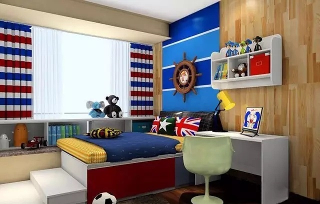 “這是一個(gè)男孩房設(shè)計(jì),空間雖不大但是格局方正。設(shè)計(jì)師把榻榻米和飄窗一起裝進(jìn)這個(gè)兒童房,不僅有了1.5米的床還能留出較寬敞的活動空間!”