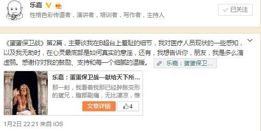 樂嘉在文中不僅敘述了傷后2次就醫(yī)照B超的過程,以及對(duì)醫(yī)療人員現(xiàn)狀的一些感知,還在文中自我安慰稱“我開始想我的丫頭靈兒,嗯,還好,樂門有后啦;我開始想40歲時(shí)幸好做了精子冷凍”。