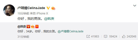 韓庚微博公布戀情,盧靖姍轉(zhuǎn)發(fā)回應