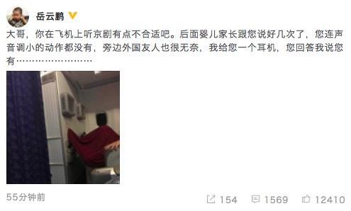 3月7日晚,岳云鵬通過(guò)微博譴責(zé)飛機(jī)上不文明現(xiàn)象,寫道:“大哥,你在飛機(jī)上聽京劇有點(diǎn)不合適吧。后面嬰兒家長(zhǎng)跟您說(shuō)好幾次了,您連聲音調(diào)小的動(dòng)作都沒(méi)有,旁邊外國(guó)友人也很無(wú)奈,我給您一個(gè)耳機(jī),您回答我說(shuō)您有……”