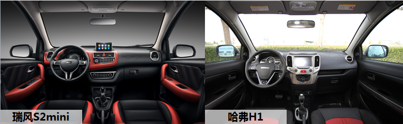 內(nèi)飾設(shè)計方面,瑞風(fēng)S2mini采用紅黑配色,給人活潑時尚之感。且中控臺造型簡潔,懸浮式顯示屏的點綴更顯科技感。哈弗H1的內(nèi)飾設(shè)計雖同走簡潔風(fēng),但其中控臺銀色面板卻稍顯老氣,顯然與90后追逐新鮮感的個性不符。