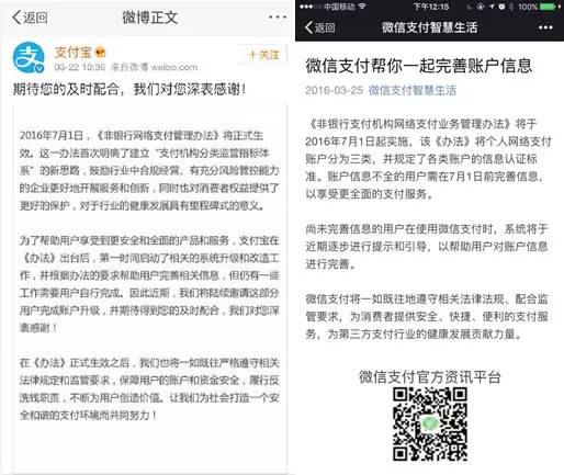 22日,支付寶官方微博發(fā)表聲明稱(chēng),“支付寶將在《辦法》出臺(tái)后正式啟動(dòng)相關(guān)系統(tǒng)升級(jí)與改造工作,并且?guī)椭脩?hù)進(jìn)行相關(guān)操作?!?5日中午,微信支付在其官方賬號(hào)“微信支付智慧生活”發(fā)布了題為《微信支付幫你一起完善賬戶(hù)信息》的短文。