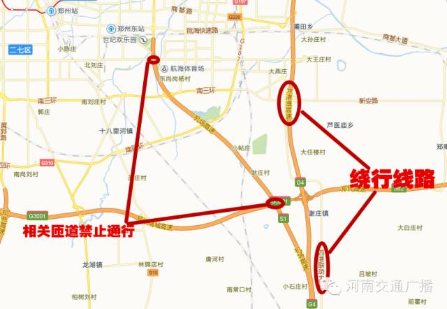 原由鄭州機(jī)場高速進(jìn)入鄭州市區(qū)方向車輛繞行京港澳高速公路、四港聯(lián)動大道或其他道路通行。屆時機(jī)場高速公路與航海路互通、西南繞城互通、機(jī)場互通的相關(guān)匝道將禁止通行。