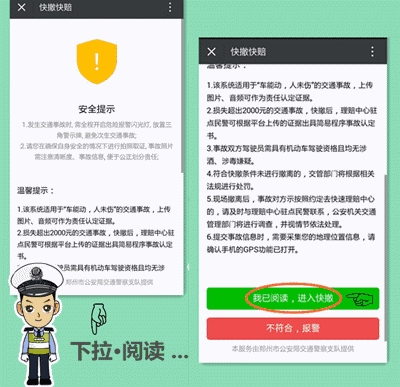 支隊(duì)科研所此次研發(fā)的交通事故快賠快撤功能,跳出了以往單方損失2000元以下的限制,只要在交警二大隊(duì)轄區(qū):嵩山路(含)嵩山路以西區(qū)域及中原區(qū)、西開(kāi)發(fā)區(qū)全境,公共道路上發(fā)生的兩車(chē)事故,車(chē)輛能夠正常駕駛,沒(méi)有人員受傷,就可以通過(guò)“鄭州交巡警二大隊(duì)微信公共平臺(tái)”進(jìn)行快撤快賠處理。