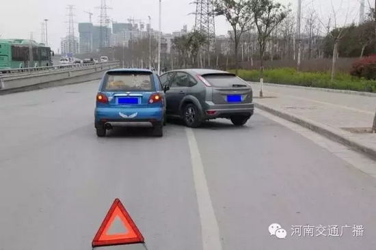 3、為避免發(fā)生次生交通事故,以及在處理事故時(shí)被當(dāng)成違法停車(chē)誤抓拍,請(qǐng)?jiān)谑鹿侍幚硗戤呏埃涕_(kāi)啟雙閃燈,放置三角警示牌;