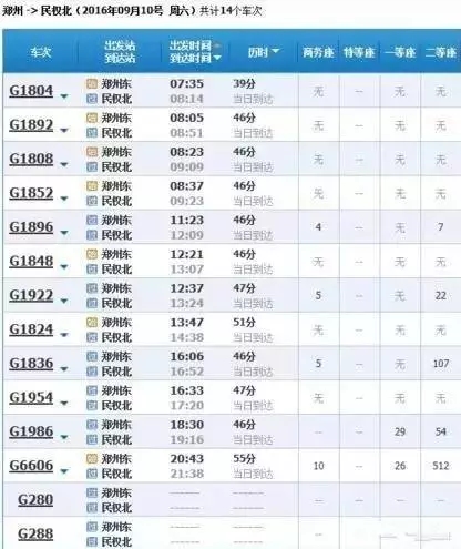 最快的一趟車G368/9,19點05分從上海虹橋始發(fā),23點02分到達鄭州東,耗時3小時57分,中途僅??磕暇┖托熘菡?,其余列車運行時間都在4小時到5小時之間。