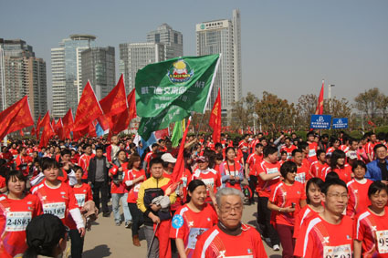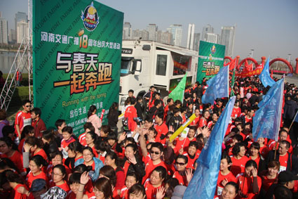 3月27上午,綠城鄭州陽光明媚,春意盎然,2011年中國鄭開國際馬拉松賽分別在鄭州市鄭開大道和鄭東新區(qū)商務(wù)內(nèi)環(huán)鳴槍舉行,來自28個(gè)國家和地區(qū)的近3萬名選手參加了比賽。河南交通廣播也組織了由1041名車友組成的“千人跑友團(tuán)”參賽,大家一起跑進(jìn)春天,共同慶祝交通廣播成立18周年。