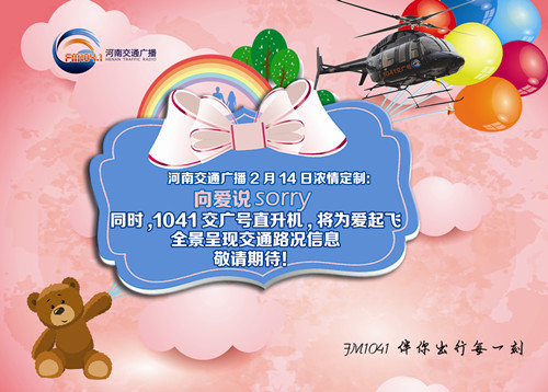 2月14日當(dāng)天,1041交廣號(hào)直升機(jī)也將再次為愛(ài)起飛,在全景呈現(xiàn)路況信息的同時(shí),為您提供情人節(jié)私人定制飛行。如果你足夠幸運(yùn),將有機(jī)會(huì)坐上1041交廣號(hào)直升機(jī),和你的那個(gè)Ta獨(dú)享二人世界,遨游藍(lán)天、一起俯瞰鄭州美景。