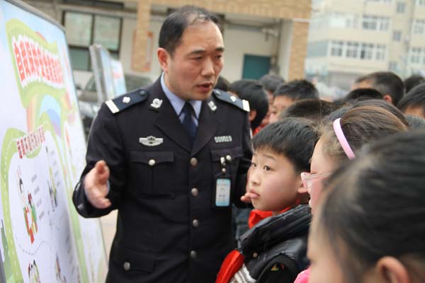 小學(xué)生們認真聽警察叔叔講解安全知識