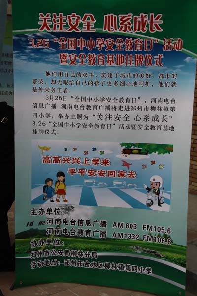 2012年3月26日是第十七個“全國中小學(xué)安全教育日”,在教育日當(dāng)天舉行“中小學(xué)安全教育基地”掛牌儀式,河南電臺信息廣播依托日常欄目《法制新河南》的整合資源,將中小學(xué)安全宣傳教育常態(tài)化。據(jù)河南電臺信息廣播總監(jiān)李金鋒介紹,“教育基地建立以后,河南電臺信息廣播將聯(lián)合鄭州市公安局柳林分局,通過信息廣播AM603、FM105.6廣播頻率,以《法制新河南》欄目為陣地,長期持久的宣傳中小學(xué)安全教育知識,并為柳林鎮(zhèn)第四小學(xué)的學(xué)生提供書籍、器械等安全教育的物品,節(jié)目主持人和柳林分局的警官還將不定期的深入校園內(nèi),跟學(xué)生們面對面的交流、一對一的輔導(dǎo)?!?/p>