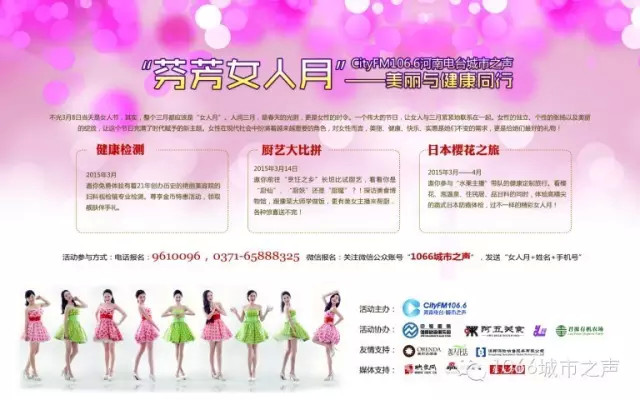 2、微信報(bào)名:關(guān)注微信公眾賬號(hào)“1066城市之聲”,發(fā)送“女人月+姓名+手機(jī)號(hào)”