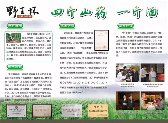 通過(guò)多方溝通尋訪,于2009年開(kāi)始與多家大專院校合作共同研發(fā)鐵棍山藥酒,研發(fā)過(guò)程也是歷經(jīng)了不少的艱辛坎坷,歷時(shí)5年,終于成功。于2014年獲得了國(guó)家專利,并于2014年成立了野王懷氏生物科技有限公司,鐵棍山藥酒通過(guò)低溫發(fā)酵釀造成酒,不僅能將山藥中的營(yíng)養(yǎng)成份悉數(shù)保留,藥借酒力,酒攜藥功,更是使人體吸收率大幅提高,賦予了懷鐵棍山藥更高的價(jià)值。同時(shí),與當(dāng)?shù)厣剿幏N植戶和合作社簽訂常年收購(gòu)合同,穩(wěn)定了山藥的市場(chǎng)價(jià)格,也帶領(lǐng)著大家一起致富奔小康。