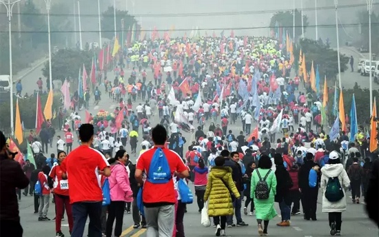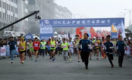 11月13日上午,隨著2016嵩山少林國(guó)際馬拉松賽發(fā)令汽笛鳴響,來自世界16個(gè)國(guó)家和地區(qū)的近15000名跑友跑出起點(diǎn),瞬間匯聚成流動(dòng)的七彩人潮,為嵩山美景增架起一道絢麗的彩虹。
