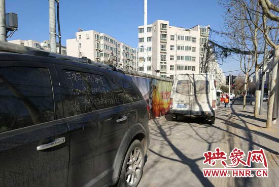 3月26日下午15時(shí)30分左右,在汝河路昆侖路交叉口西北角人行道上,一輛黑色越野頭東尾西的停在汝河路北邊的人行道上,右邊車(chē)窗上有人用黃色粉筆寫(xiě)了兩行大字提醒車(chē)主把車(chē)挪走。