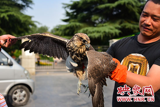 映象網(wǎng)快訊(記者 邱延波 文/圖)獵隼,大型猛禽,國(guó)家二級(jí)重點(diǎn)保護(hù)動(dòng)物。6月15日,中牟一農(nóng)民竟然在蒜地里發(fā)現(xiàn)一只受傷的獵隼。