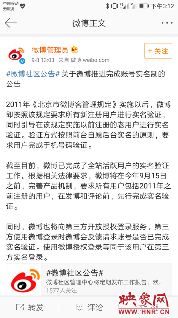 映象網(wǎng)快訊(記者 阮海峰 文/圖)9月8日下午新浪微博官方發(fā)布消息稱,9月15日之前包含2011年之前注冊(cè)的所有用戶均需要完成微博實(shí)名認(rèn)證,否則無(wú)法發(fā)送新微博以及評(píng)論。