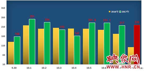據(jù)悉,10月1日零時至10月7日24時,全省高速公路出口累計通行車輛1522.04萬輛,與2016年同比增長10.3%,其中:小型客車1346.27萬輛,占88.45%,免通行費(fèi)9.3億元;“綠色通道”車輛14.75萬輛,免通行費(fèi)6295.31萬元。
