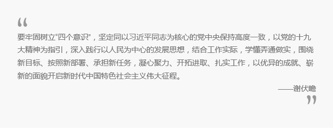 謝伏瞻說,黨的十九屆一中全會選舉習近平同志為黨的總書記,這是全黨全國各族人民的共同心愿,習近平總書記是全黨擁護、人民愛戴、當之無愧的黨的領袖。大家要切實增強“四個意識”,同以習近平同志為核心的黨中央保持高度一致。中國特色社會主義進入了新時代,這是一個重大的政治判斷,為我們國家發(fā)展標明了準確的歷史坐標和發(fā)展方位。