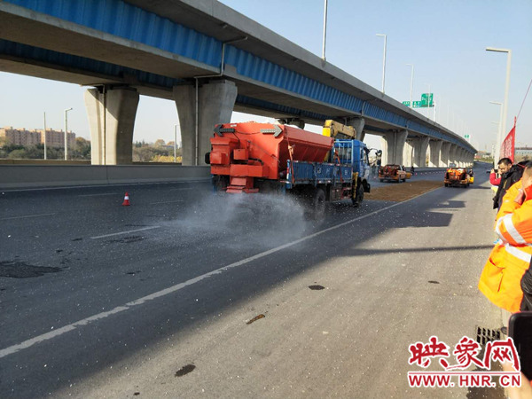 快速路的除雪保潔工作,趙勇總結(jié)為“一融、二鏟、三輥掃、四清運(yùn)”。一融:氣溫在0度以下撒融雪劑。因?yàn)闇囟鹊蜆蛏下访鏁?huì)結(jié)冰,在橋上部分少量食用融雪劑,目的達(dá)到不結(jié)冰。二鏟:將不結(jié)冰的雪鏟到兩側(cè)。三輥掃:雪鏟滾刷清掃積雪。四清運(yùn):人機(jī)配合全面清除殘存冰雪。