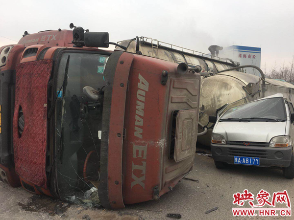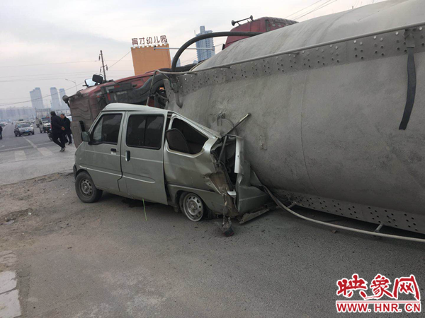 鄭州新苑路一槽罐車側(cè)翻壓扁面包車 面包車司機(jī)沒有受傷
