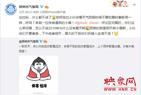 然而,就在記者發(fā)文前“鄭州市氣象局”的最后一篇微博中,氣象局小編面對完全不配合的暴雪,已徹底棄療,不再談?wù)撊魏闻c雪有關(guān)的話題,反而談?wù)撈鹋灾b,甚至把自己“老寒腿”的秘密也共享給大家。
