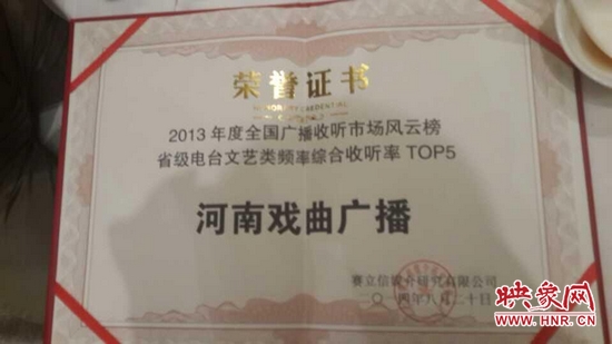 2014年8月20日晚上,國(guó)內(nèi)知名廣播收聽(tīng)率調(diào)查公司賽立信媒介研究有限公司在成都舉行發(fā)布會(huì),授予河南電臺(tái)戲曲廣播娛樂(lè)976“2013年度全國(guó)廣播收聽(tīng)率TOP5”榮譽(yù)稱號(hào)。