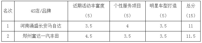 按照慣例,還是從排名倒數(shù)第一(黑榜第一名):河南涌盛長(zhǎng)安馬自達(dá)4S店,不過(guò)11分已經(jīng)是不錯(cuò)的成績(jī)了,只怪其他店整體水平太高,就認(rèn)慫吧~
