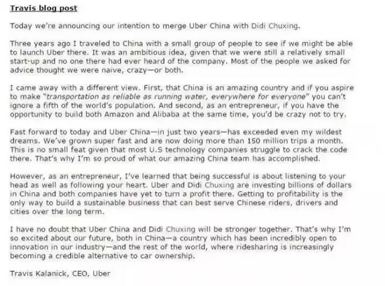 今天我們宣布,我們打算讓優(yōu)步中國(guó)(Uber China)與滴滴出行進(jìn)行合并。