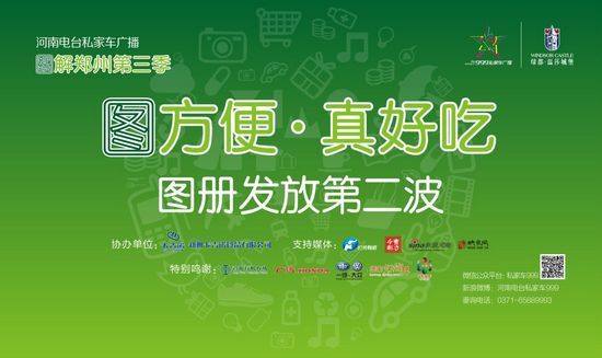 河南電臺(tái)私家車廣播2013大型公益系列活動(dòng)——“圖解鄭州”第三季圖方便·真好吃,圖冊(cè)發(fā)放第二波于2013年7月7日在鄭州市東風(fēng)路與天明路交匯處的天旺優(yōu)庫(kù)和商都路與七里河南路交匯處的華豐燈飾界免費(fèi)發(fā)放。