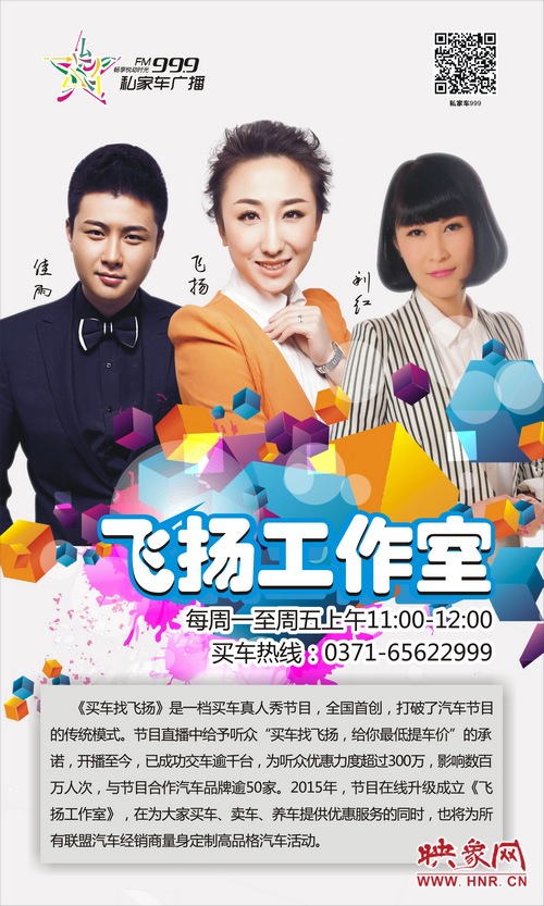 《買車找飛揚》是河南電臺私家車999于2013年1月29日開設(shè)的一檔為受眾提供全省最低買車優(yōu)惠的服務(wù)類節(jié)目,節(jié)目播出頻率為FM99.9,每個工作日上午的11:30-12:00直播。