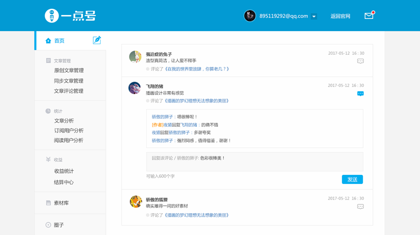 本次積分系統(tǒng)升級(jí)之后,一點(diǎn)號(hào)、鳳凰號(hào)的作者將會(huì)更方便快捷的在后臺(tái)查看用戶評(píng)論,參與用戶討論回復(fù),點(diǎn)贊自己欣賞的讀者評(píng)論,能夠更全面更多元化的與讀者進(jìn)行互動(dòng)。