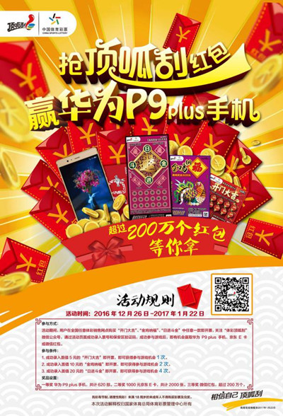 值此新年來臨之際,體彩頂呱刮為回饋彩民朋友一年來的支持,以及對體彩頂呱刮的關(guān)注,在新年期間開展“搶頂呱刮紅包,中華為P9plus手機(jī)”活動(dòng)。